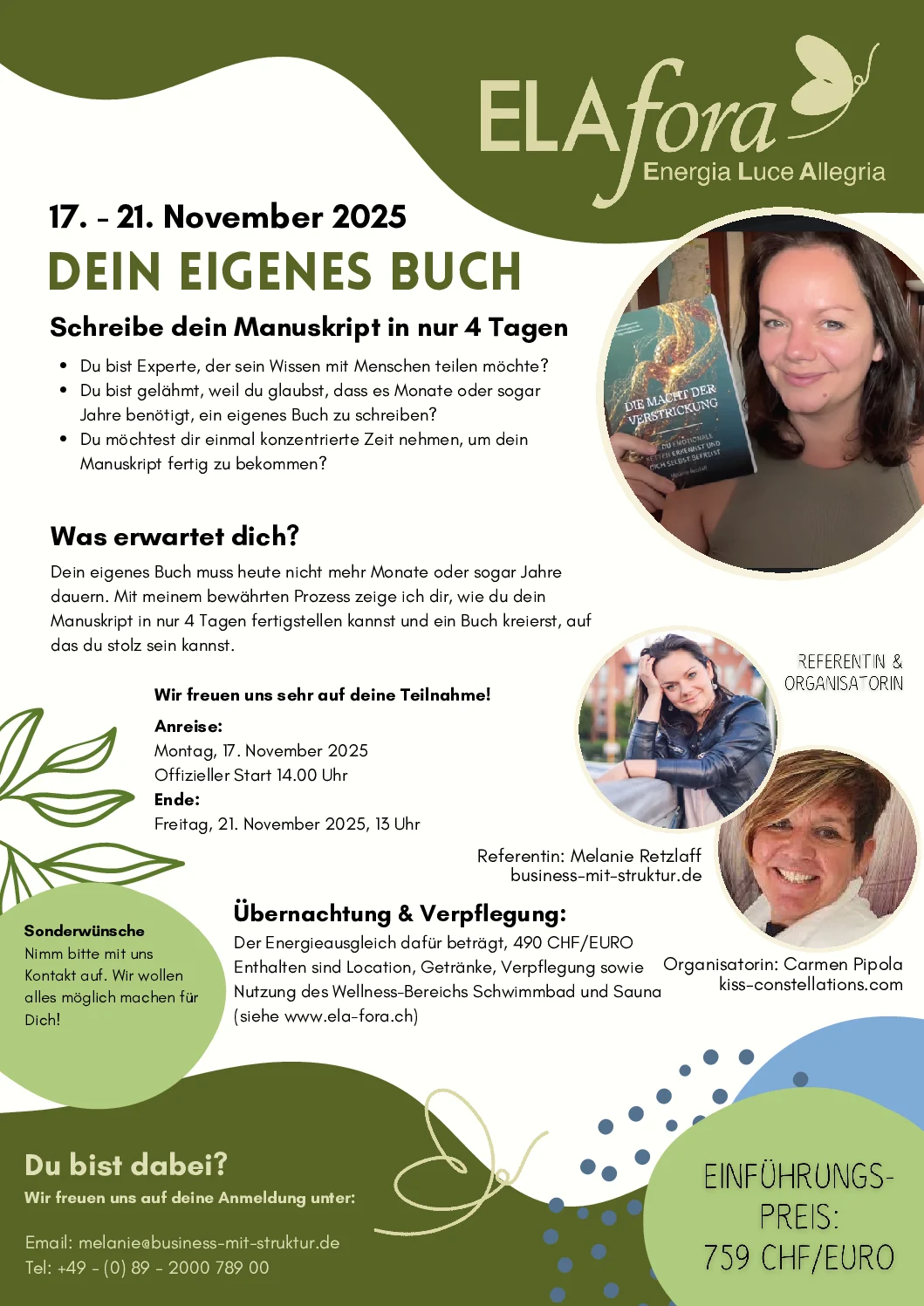 Wir bieten dir die Möglichkeit, dein eigenes Buch in nur 4 Tagen zu schreiben. Im ELAfora in Graubünden entwickelst du mit Melanie Retzlaff deine Strategie, strukturierst Inhalte, nutzt ChatGPT und vollendest dein Manuskript – inkl. Übernachtung, Verpflegung & Wellness.