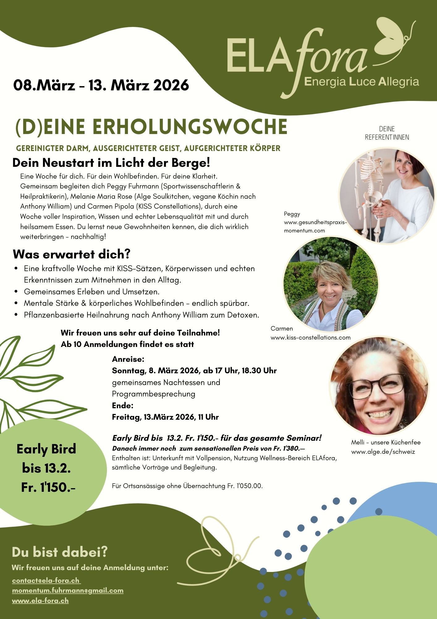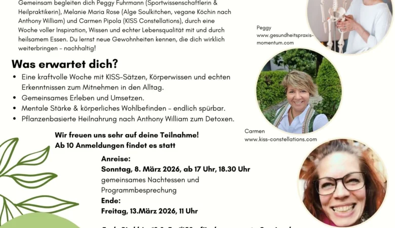Eine Woche für dich. Für dein Wohlbefinden. Für deine Klarheit. Gemeinsam begleiten dich Peggy Fuhrmann (Sportwissenschaftlerin & Heilpraktikerin), Melanie Maria Rose (Alge Soulkitchen, vegane Köchin nach Anthony William) und Carmen Pipola (KISS Constellations), durch eine Woche voller Inspiration, Wissen und echter Lebensqualität.