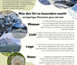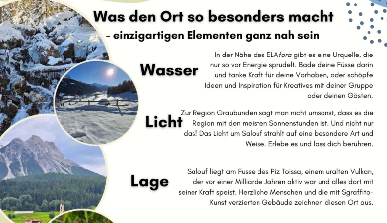 Unsere Location liegt im wunderschönen Salouf in Graubünden, eingebettet in den Naturpark ELA mit einer grossen Artenvielfalt an Schmetterlingen, einer ausgedehnten Wald- und Wiesenlandschaft, zahlreichen Wanderwegen und einem Wasserfall – quasi vor der Haustüre.