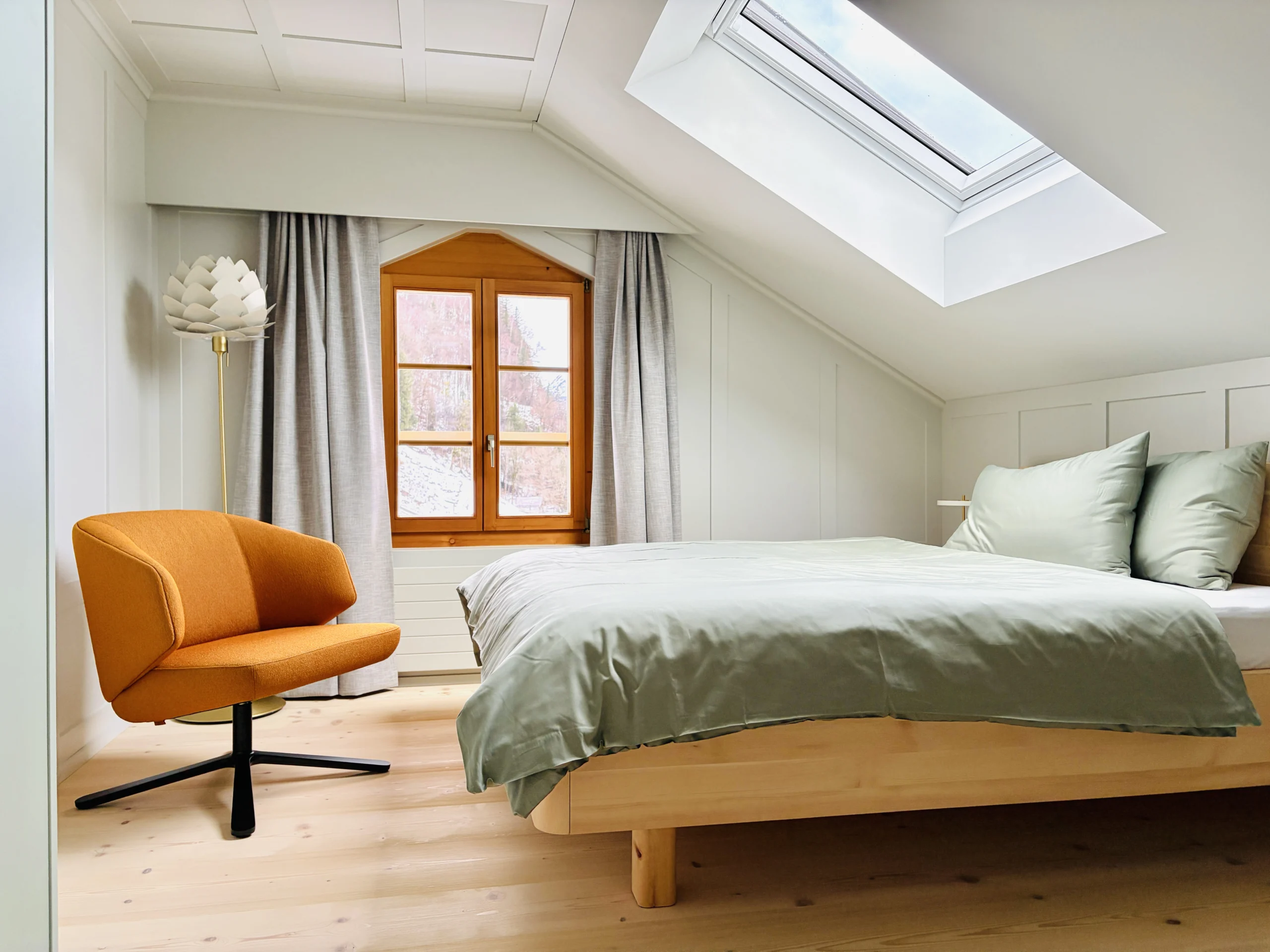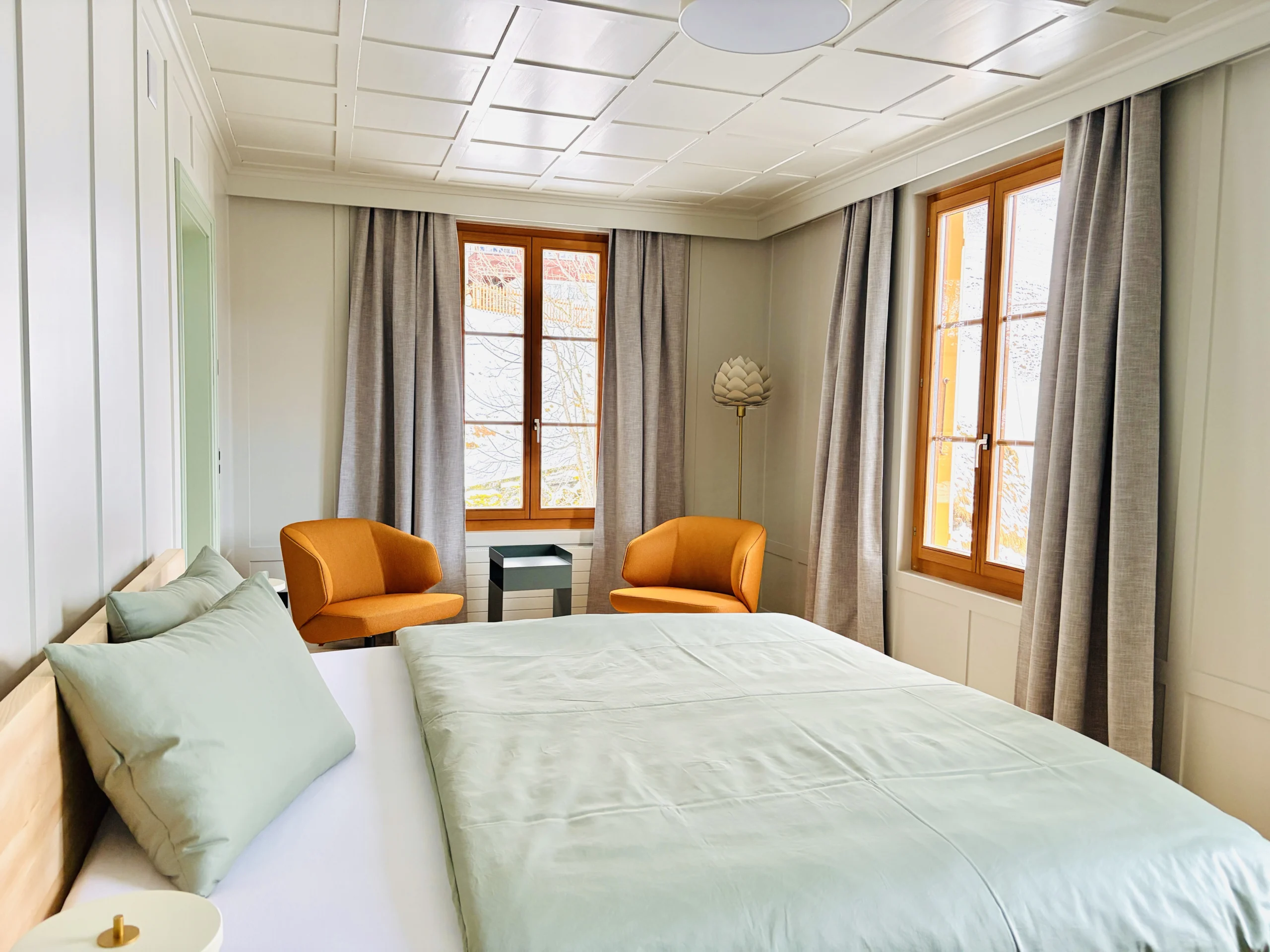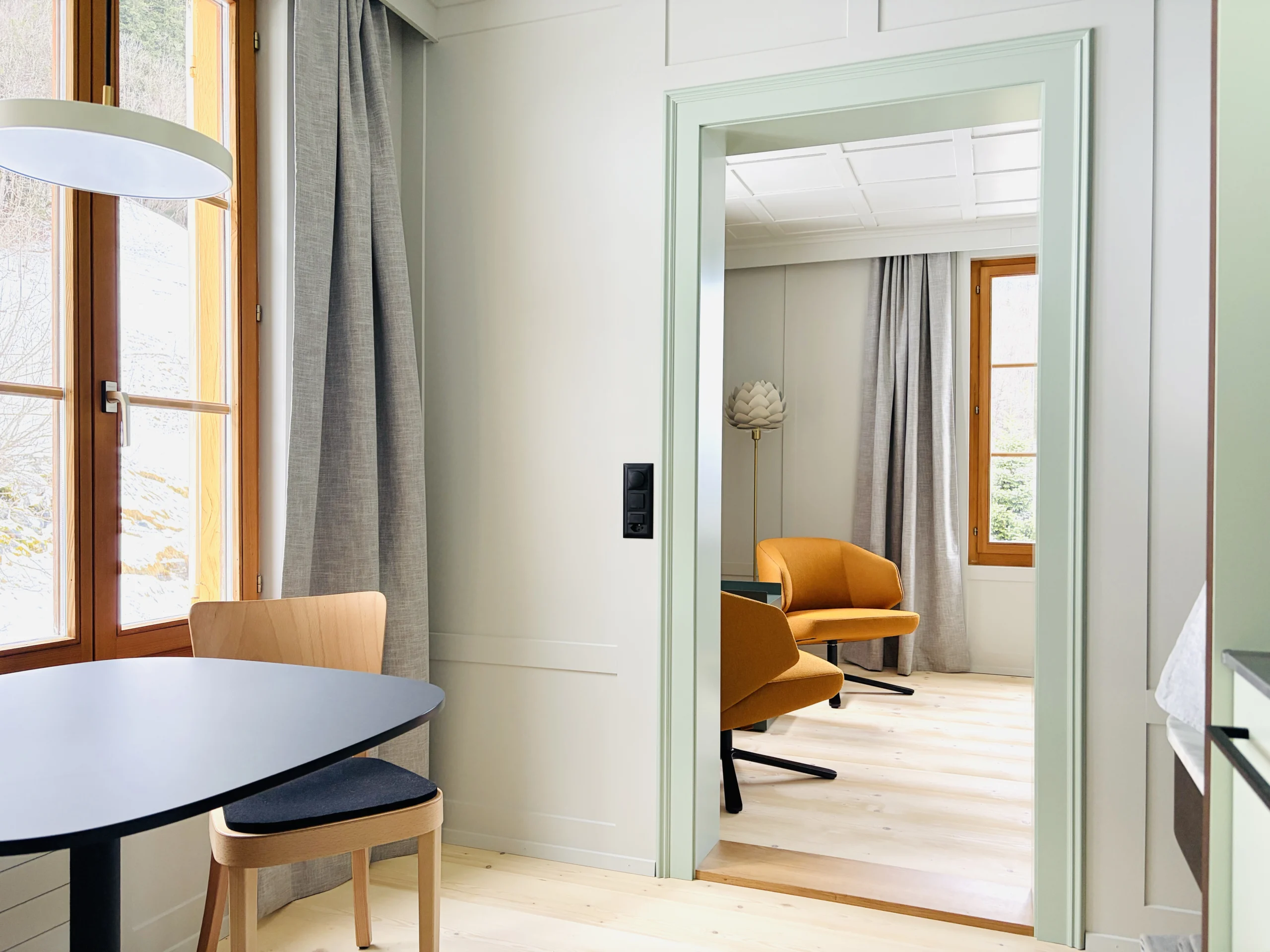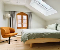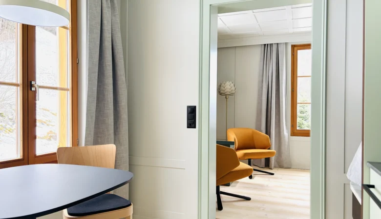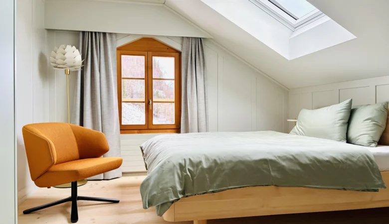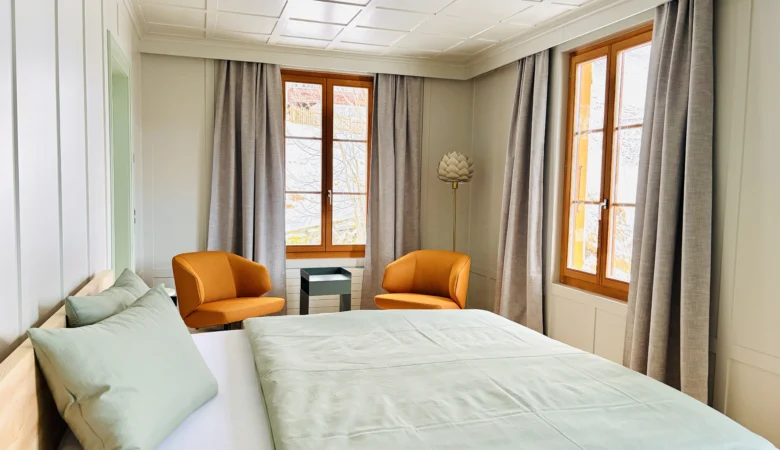 Wo einst noble Gäste nächtigten, bietet die Schwendi sechs durchdachte Apartments. Je zwei Zimmer sind miteinander verbunden. Im einen ein dezent eingebauter Kubus – mit Kochbereich, Lavabo, Dusche und WC. Das andere bleibt schlicht und gemütlich – ein Ort, der zum Ankommen einlädt. Alles in zurückhaltendem Design, eingebettet in die alte Substanz – kein übertriebener Luxus, sondern achtsame Gestaltung mit Sinn für das Schöne und das Wesentliche.
