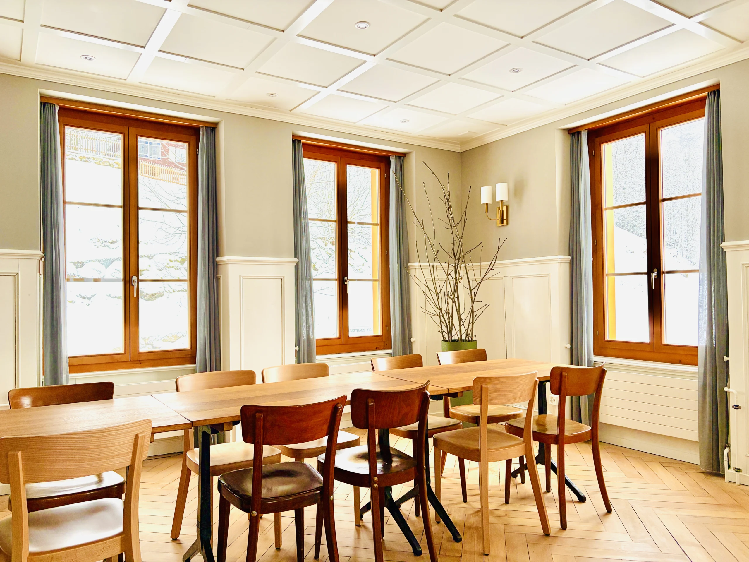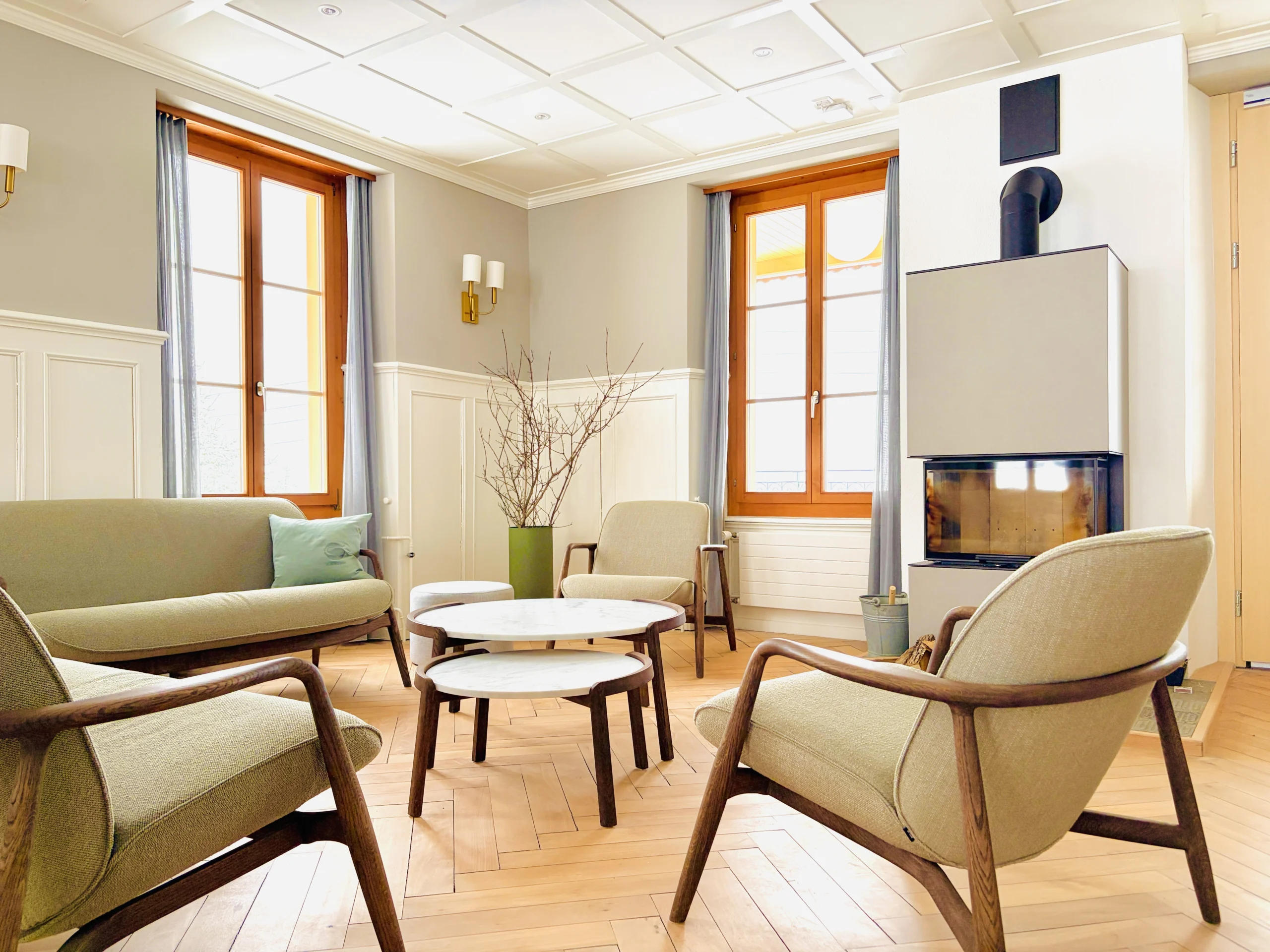 Die historische Gaststube mit wohligem Feuer im Schwedenofen für die Übergangszeit ist geschaffen für vertraute Abende. Der kleine Salon anstelle des bisherigen Ausschanks bietet Raum für ungezwungene Begegnung oder das bewusste Entspannen. Rückzug und Gemeinschaft fliessen ineinander. Bei maximal neun Gästen bleibt viel Raum für das, was gerade dran ist.